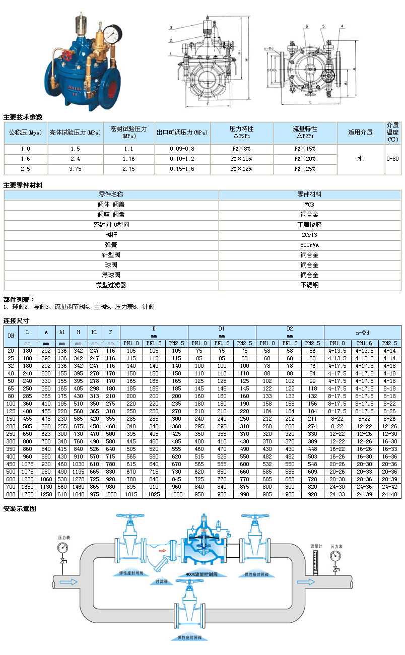400X流量控制閥由主閥、流量調(diào)節(jié)閥、針閥、導(dǎo)閥、球閥、微形過濾器和壓力表組成水力控制接管系統(tǒng)。利用水力自動操作,控制和調(diào)節(jié)主閥開度,使通過主閥的流量保持不變。本產(chǎn)品利用水力自力控制,不需要其它裝置和能源,保養(yǎng)簡便,流量控制穩(wěn)定。本系列閥門產(chǎn)品廣泛用于高層建筑、生活區(qū)等供水管網(wǎng)系統(tǒng)及城市供水工程。當(dāng)閥門從進(jìn)口端給水時(shí),水流過針閥進(jìn)入主閥控制室,并經(jīng)過導(dǎo)閥、球閥流出主閥控制室到出口,此時(shí)主閥處于全開或浮動狀態(tài)。調(diào)定主閥上部的流量調(diào)節(jié)閥,可為主閥設(shè)定一定開度。調(diào)節(jié)針閥開度和調(diào)節(jié)導(dǎo)閥彈簧壓力,即可使主閥開度保持在設(shè)定開度,并在壓力變化時(shí)導(dǎo)閥進(jìn)行自動調(diào)節(jié),保持流量不變。 |