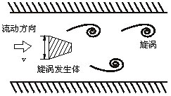 在測(cè)量管中垂直插入一個(gè)柱狀物時(shí),流體通過(guò)柱狀物兩側(cè)就交替地產(chǎn)生有規(guī)則的旋渦(如圖所示),這種旋渦列被稱為卡門渦街。卡門渦街的釋放頻率與流體的流動(dòng)速度及柱狀物的寬度有關(guān),可用下式表示: |