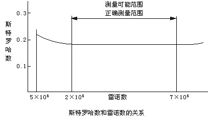卡門渦街釋放頻率f和流速v成正比,因此通過(guò)測(cè)量卡門渦街釋放頻率就可算出瞬時(shí)流量。斯特羅哈數(shù)是渦街流量計(jì)的重要系數(shù)。在曲線的St≈0.17的平直部分,旋渦的釋放頻率與流速成正比,所以檢出頻率f就可求得流速v,由v求出體積流量。 |