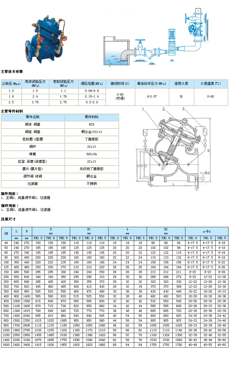 工作原理 當(dāng)水泵起動(dòng)起后,水壓作用于主閥閥盤(pán)下面和控制室下腔,此壓力使主閥開(kāi)啟,控制室上腔的水經(jīng)過(guò)調(diào)節(jié)閥B緩緩排到出口端,主閥緩緩開(kāi)啟。設(shè)定調(diào)節(jié)閥的開(kāi)度可得到合適地主閥開(kāi)啟速度。當(dāng)水泵停止工作后,進(jìn)口端水壓迅速下降,在自重、彈簧壓力作用下快速關(guān)閉大部分開(kāi)度,防止了水倒流余下的開(kāi)度由控制室上腔的水壓和下腔水壓聯(lián)合作用下緩緩關(guān)閉,關(guān)閉速度減慢形成了緩沖,防止壓力劇增。設(shè)定調(diào)節(jié)閥A、B的開(kāi)度和開(kāi)度比可得到合適的閥門(mén)啟閉速度。